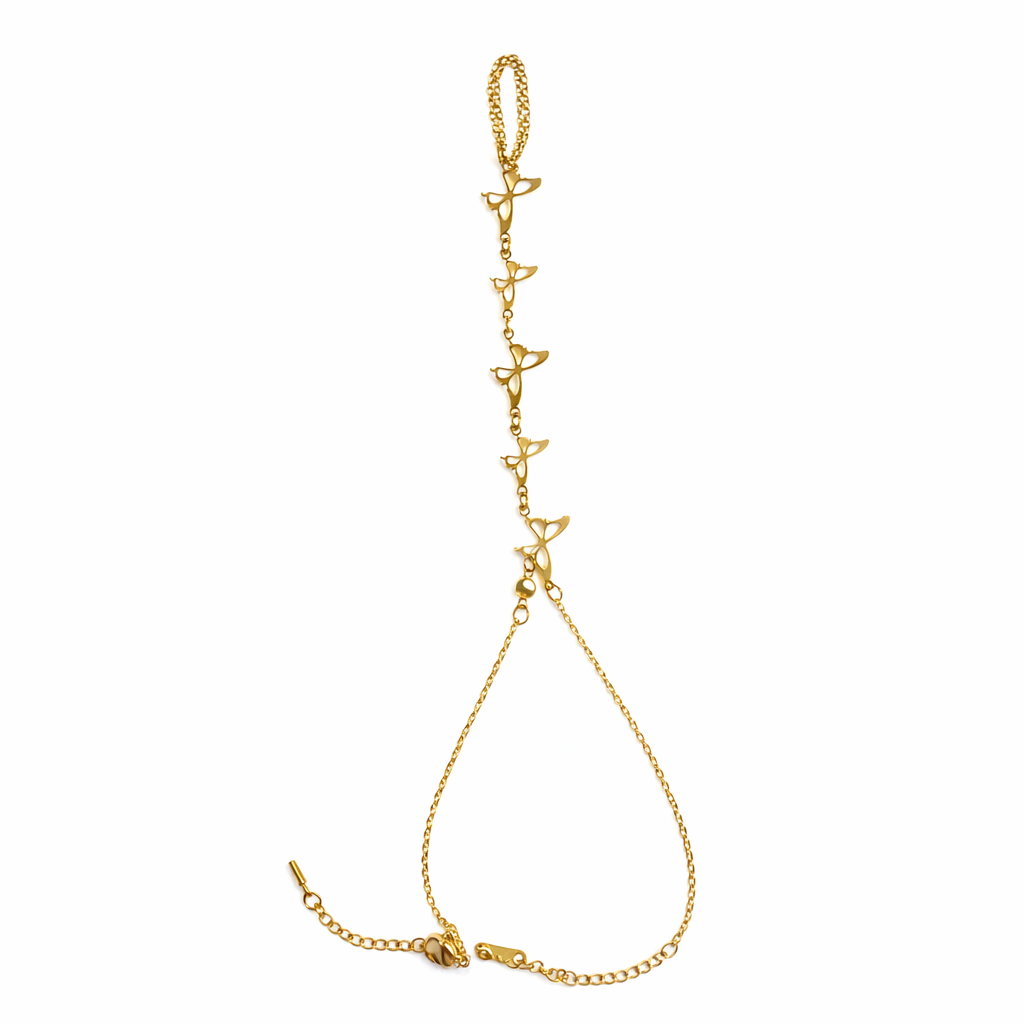 .A delicate, feminine design that adds a touch of charm and distinction to your wrist. It combines a wrist bracelet and a finger ring with a smooth chain adorned with butterflies, adding a touch of softness and elegance